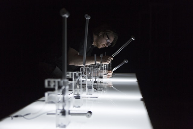 Frequencies (a) est une performance sonore qui allie les fréquences acoustiques de diapasons aux fréquences purement audio-numériques. L’artiste organise en temps réel des séquences numériques qui actionnent mécaniquement les diapasons avec précision. Le dispositif repose sur une table lumineuse où chaque diapason résonne en synchronisme avec des éclats de lumière, créant une composition audio-lumineuse se rapprochant d’un certain minimalisme.